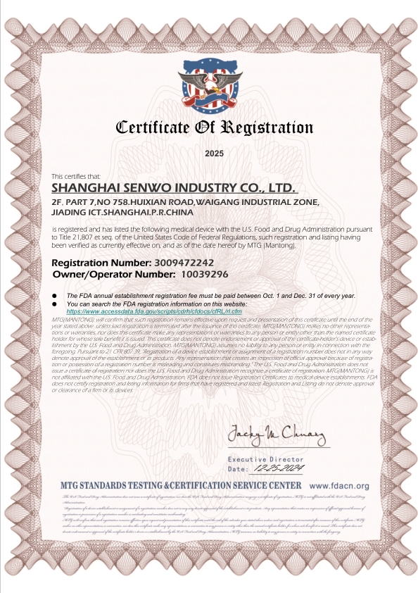 By now, Senwo has obtained the certification of ISO 13485: 2016 quality management system certifications, CE , FDA, CPSIA, RSW, BSCI and MSDS test reports of all series products and kept up dated constantly, win the reputation of the domestic and international customers.